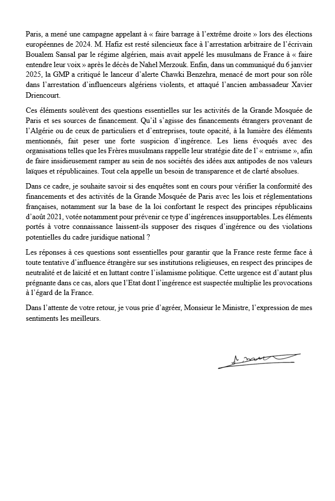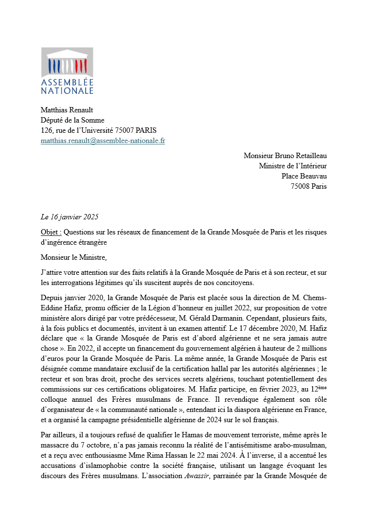 Volksvertegenwoordiger Matthias Renault heeft op 16 januari namens Rassemblement National (RN) een brief (deel 1 en deel 2) aan de minister van Binnenlandse Zaken geschreven over de recente bedreigingen door Algerijnse pro regime activisten. De politicus wil tevens weten wie de financiële geldschieters zijn van de moskee en wat is de rol van de instelling in het aansturen van pro regime activisten. Hij citeert de rector van de moskee die op 17 december 2020, een paar maanden na zijn aantreden tot het bestuur, verklaarde: "De Grote Moskee van Parijs is Algerijns en zal altijd zo blijven."