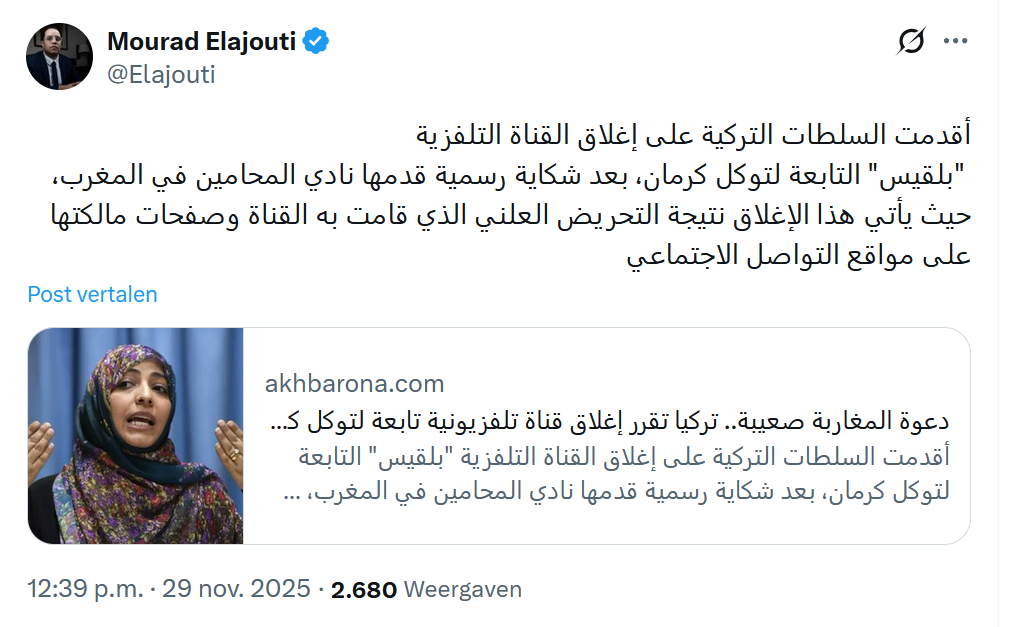 Tawakkol komt uit Jemen en heeft een Turks paspoort. Ze is eigenaar van een TV zender die op bevel van de rechter is gesloten wegens het propageren van een “Intifada in Marokko”, aldus Mourad Elajouti, woordvoerder van de advocatenclub.