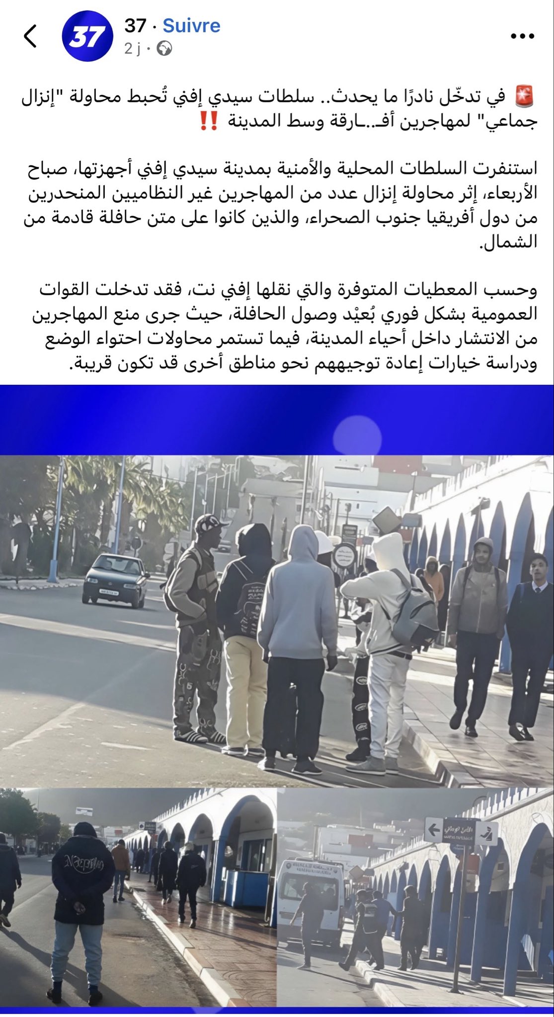 Bij gebrek aan een oplossing worden de illegalen over kleine steden gespreid zonder opvang of begeleiding. Ze worden naar kleinere plaatsen zoals Taroudant, Tiznit en deze week ook naar Sidi Ifni verplaatst waar de lokale autoriteiten hebben geweigerd een bus vol illegalen toe te laten.