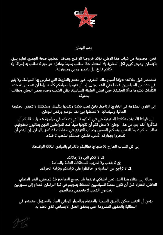 GenZ, een van de initiatiefnemers van aanhoudende demonstraties in Marokko, heeft laat op de avond van dinsdag 30 september een persbericht gepubliceerd waarin de regerende politieke klasse wordt gevraagd consequenties te trekken uit de onvrede van jongeren. Het persbericht bevat tevens een oproep aan de veiligheidsdiensten om zich niet te laten gebruiken ten einde de demonstraties de kop in te drukken. Ook demonstranten worden tot kalmte geroepen na een reeks incidenten in verschillende steden.