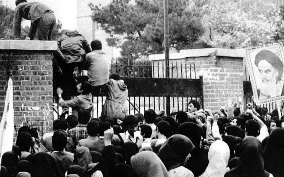 Afbeelding: Op 4 november 1979 hebben Iraanse studenten de Amerikaanse ambassade in Teheran bestormd. Ze noemden zich de Volgers van de Imam en hebben een tiental diplomaten en mariniers gegijzeld. De gijzeling zou 444 dagen duren. De toen jonge Ali Khamenei was betrokken bij de gijzeling. Bron foto: National Security Archive.