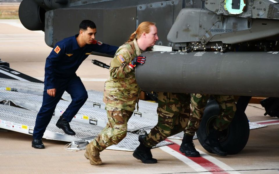Afbeelding: militairen laden een Apache helikopter uit op het vliegveld van Agadir. Credits: @anass004e