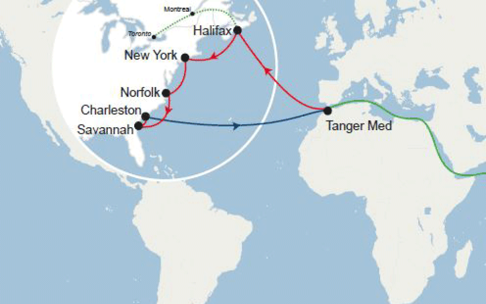 Het bedrijf CMA-CGM voor containervervoer opent nieuwe maritieme verbindingen tussen Tanger Med en een aantal havens in Noord Amerika. De nieuwe verbindingen zijn Halifax in Canada en New York, Norfolk Charleston en Savannah in Amerika. Hiermee versterkt Tanger Med de eigen positie in Afrika en in de Middellandse Zee. Bron: CMA-CGM.