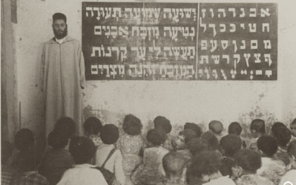 Afbeelding: een Joodse school in Marrakech van voor 1950 zoals gepubliceerd door Daniel Schroeter in zijn geschiedenis van de Joden in Zuid-Marokko.