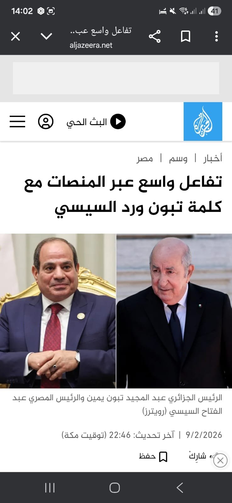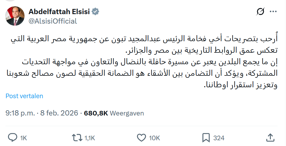 Terwijl de onderhandelingen in Madrid gaande zijn gaf president Tebboune een interview op de publieke zender. Hij bedankt Egypte voor de militaire steun tijdens de oorlog van1963 tegen Marokko. Al Sisi heeft direct op X-platform gereageerd: “Ik verwelkom namens de Arabische Republiek van Egypte de verklaring van mijn broeder de president van Algerije. De verklaring weerspiegelt de sterke historische banden tussen beide landen”.