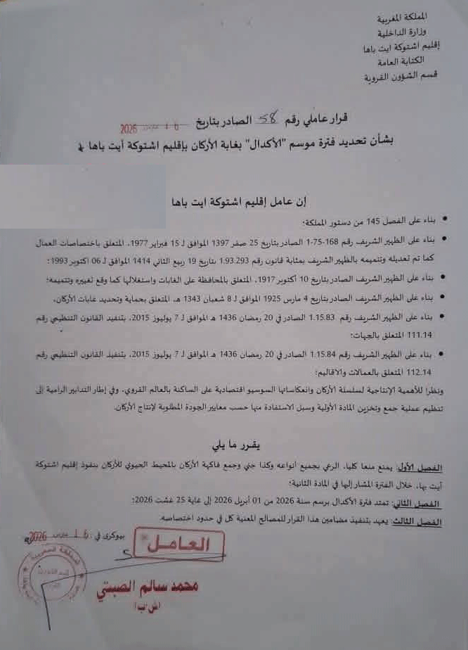 Provincie Achtouken Ait-Baha heeft een verordening gepubliceerd over het oogsten van argan vruchten. De verordening getekend door de gouverneur beroept zich op gewoonterechten in de regio gemaakt tussen 1917 en 1977 over de organisatie van de oogst en de data waarop het moet gebeuren. Volgens de verordening is het verboden tussen 01 april en 25 augustus om te oogsten.