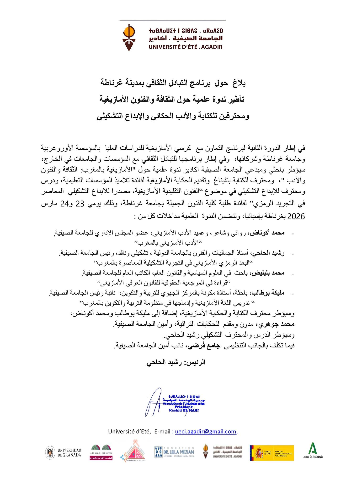 Zomeruniversiteit van Agadir organiseert op 23 en 24 maart twee culturele dagen in Grenada (PDF format in Arabisch) in samenwerking met lokale culturele en academische instellingen van de stad. Er zijn drie lezingen gepland van schrijver en radio programmamaker Mohamed Akounad, van taalkundige Lalla Malika Boutaleb en onderzoeker Rachid El Hahi. Daarnaast zijn er workshops gepland over kunst en cultuur in Marokko en Spanje. Zomeruniversiteit van Agadir is een culturele instelling opgericht in 1979 en streeft naar culturele uitwisselingen en werkt aan de internationale uitstraling van de amazigh cultuur.