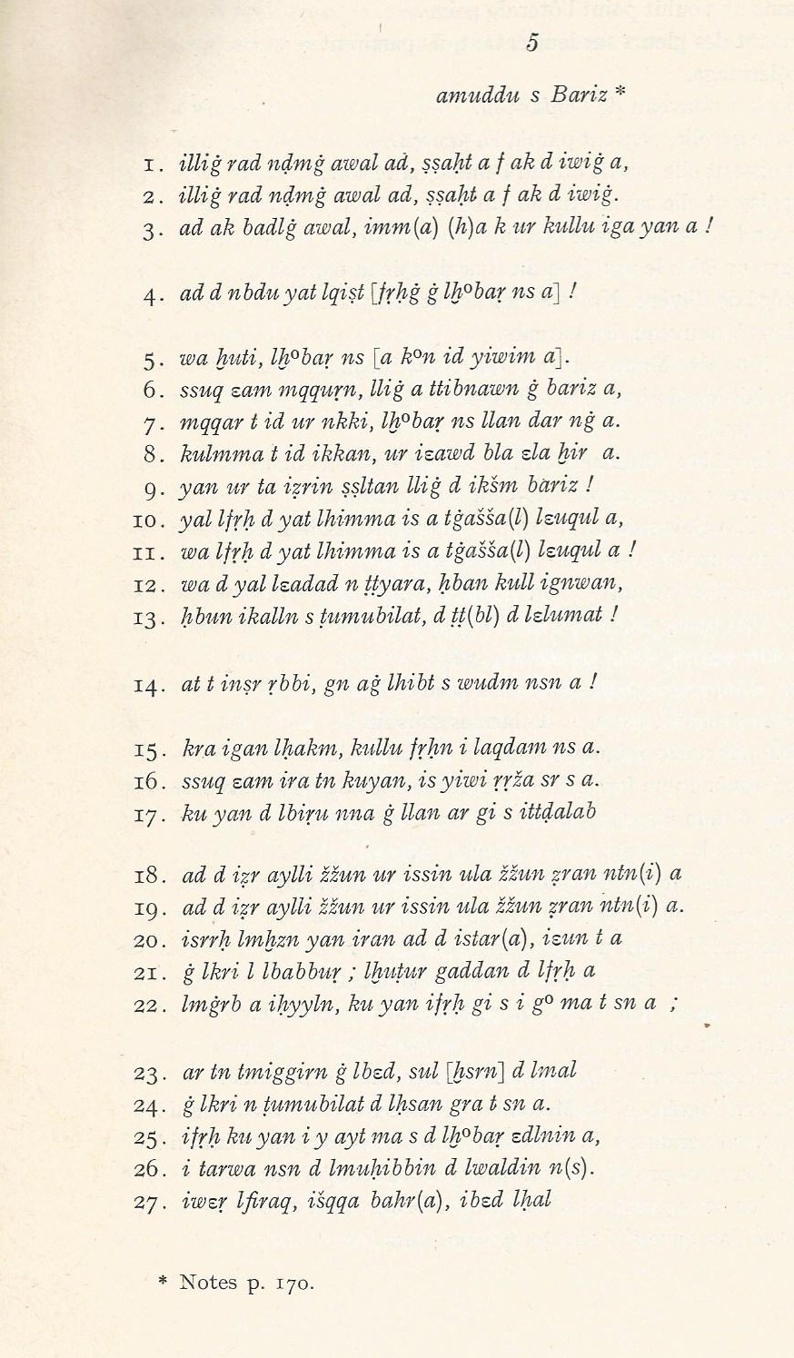 De originele tekst van het liedje Amuddu Baris is hier, hier en hier te lezen. Meer liederen gezongen door verschillende auteurs tussen 1930 en 1970 zijn in de oorspronkelijke taal met een Franse vertaling te lezen in Paulette Galand-Pernet: Receuil de poèmes Chleuhs I. Chants des trouveurs. Etudes Linguistiques XVI. Uitgeverij Klincksieck, Parijs 1972.