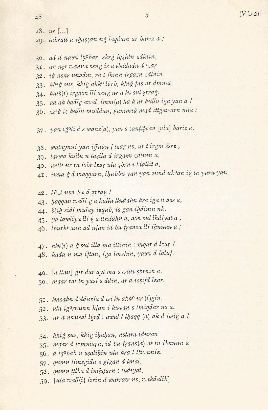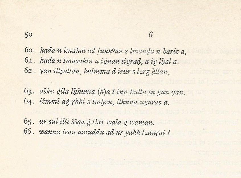 Vanaf vers 50 geeft de auteur blijk van waardering voor migranten die hij heeft ontmoet. Ze hebben hun plicht niet verzaakt ondanks het feit dat ze jaren in Frankrijk wonen. Hij verwacht in het hele gedicht dat ze de religieuze principes volgen zoals in het thuisland. Daarbij hoort ook het nodige respect en donaties ten bate van de lokale geestelijke Sidi Yaacoub, de stichter in de 16de eeuw van een religieuze orde (zawiya) wiens graf in de plaats Imi n Tatelt ligt. Zo zullen migranten volgens hem moeiteloos door hun ouders en hun omgeving worden herkend als ze teruggaan.