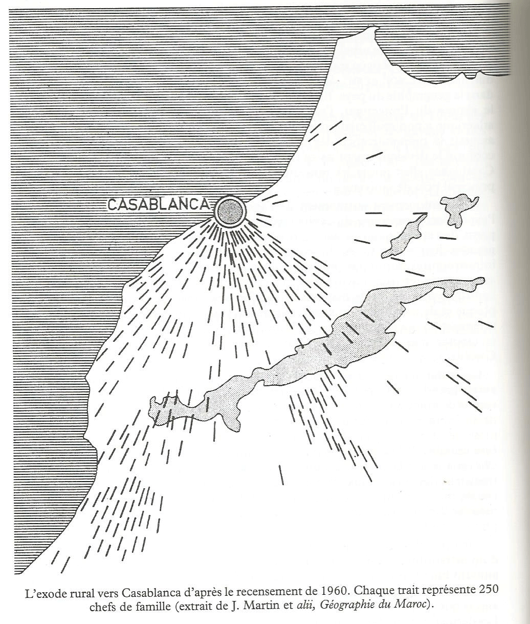 Casablanca is op dit moment de grootste stad met meer dan vier miljoen inwoners. Het was rond het jaar 1900 een kleine plaats met 12.000 mensen. De groei is te danken aan de bouw van de haven in 1912. De inwoners komen uit gebieden waar Tamazight dominant is zoals deze gtrafiek uit 1960 laat zien, gepubliceerd in Geographie du Maroc.