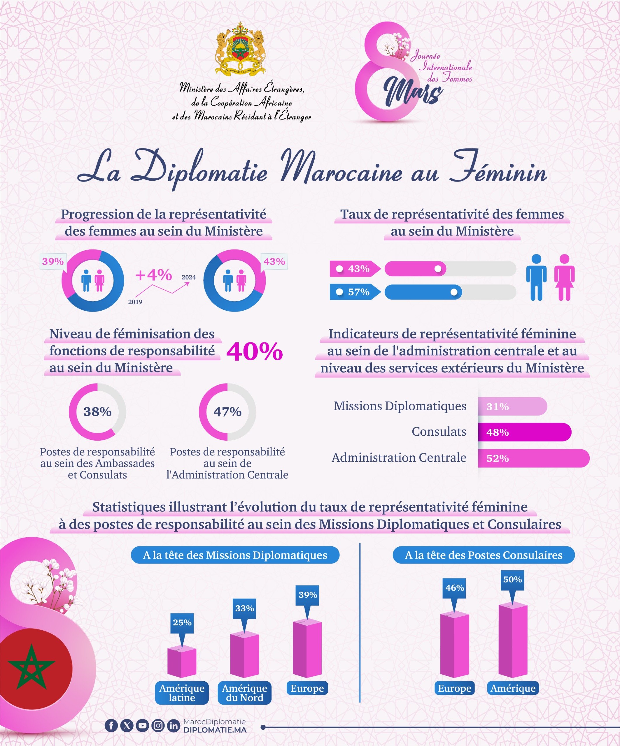 In een nieuw grafiek van het Ministerie van Buitenlandse Zaken is te zien dat het aantal vrouwen werkzaam in diplomatieke diensten tussen 2019 en 2024 met 4% is toegenomen. 43% van het personeel binnen het Ministerie is vrouw. 31% werkt voor diplomatieke missies, 48% in consulaten en 52% in de centrale administratie. 39% zijn werkzaam in Europese landen. 33% in Noord-Amerika, 25% in Zuid-Amerika. 50% staat aan het hoofd van consulaire diensten in Amerika gevolgd door Europa met 46%.