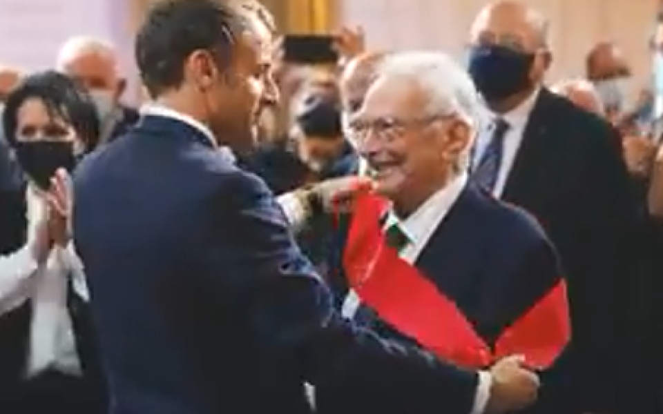 Afbeelding: Emmanuel Macron en een Algerijnse harki in 2021.