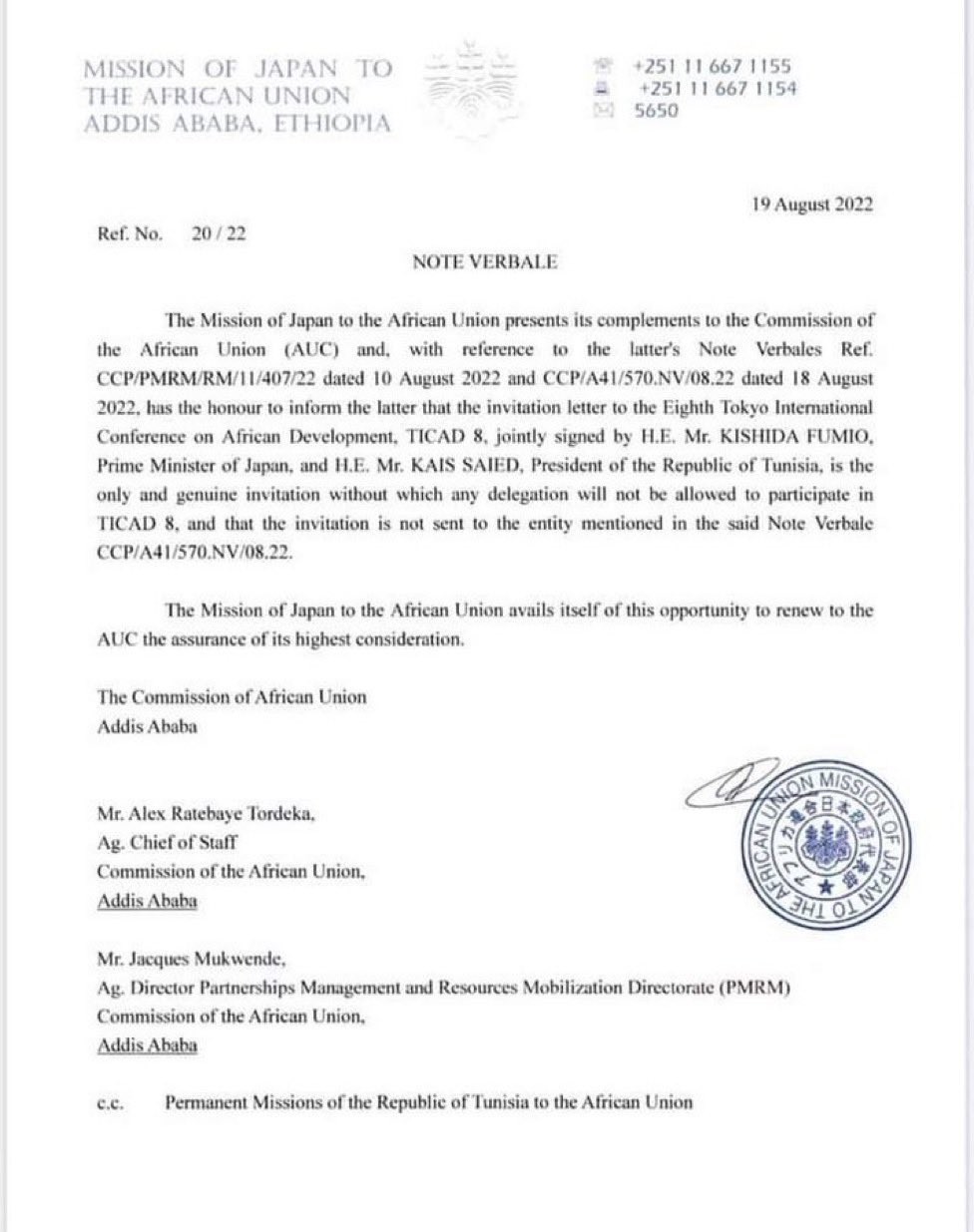 In augustus 2022 organiseerde Japan samen met de Afrikaanse Unie een bijeenkomst in Tunesië over Japanse investeringen in het continent. Polisario stond niet op de lijst omdat Japan de “Sahrawi Arabisch Republiek” niet erkent. Voorman Ibrahim Ghali verscheen toch op de bijeenkomst na een uitnodiging van president Kaïs Saïed die hem als staatshoofd heeft ontvangen. Kort hierna publiceerden Japanse diplomaten een persbericht en een video waarin ze afstand nemen van de deelname door Polisario.