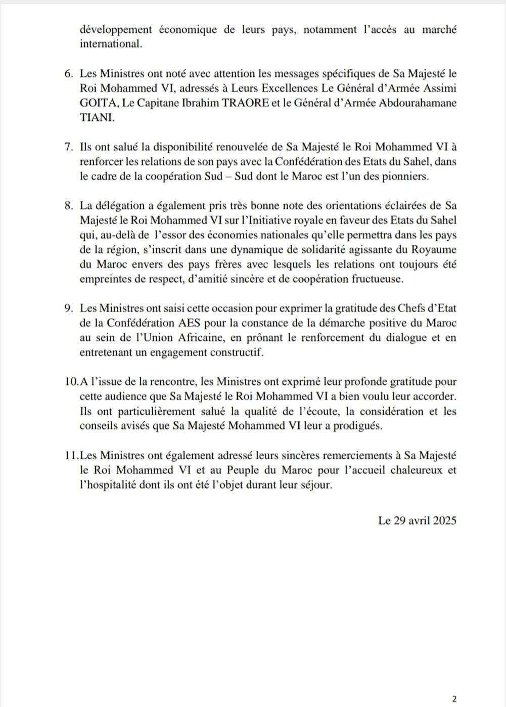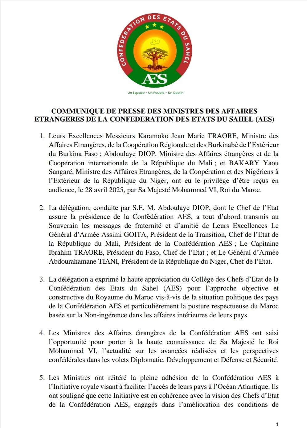 De ministers van Buitenlandse Zaken van Burkina Faso, Mali en Niger werden op 28 april voor een werkbezoek door de koning ontvangen. De drie landen vormen sinds kort een nieuwe confederatie van samenwerkende landen in de Sahel (AES). In een gezamenlijk persbericht (deel 1 en deel 2) kondigt de confederatie aan dat de betrokken landen deel willen nemen aan het Sahel – Atlantisch project voorgesteld door Marokko. Het project moet de drie landen ontsluiten via een nieuwe weg die de nieuwe haven van Dakhla Atlantic Port met de Sahel verbindt. De drie ministers zien de weg naar de Atlantische Oceaan als een kans om de economische ontwikkeling in de regio op gang te brengen door toegang te krijgen tot de internationale markt. Het project is tevens belangrijk voor Marokko om regio Sahara waar Dakhla Atlantic Port ligt te ontwikkelen.